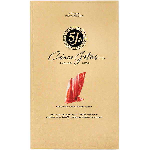 L'Épaule Ibérique Pure de Bellota 'Cinco Jotas' est élaborée avec les extrêmités avant du porc ibérique. L'élevage est extensif sur les 'dehesas' (pâturages) de la Péninsule Ibérique et l'alimentation est faite de glands durant l'époque de la 'Montanera'.